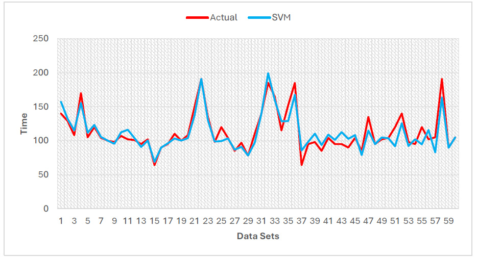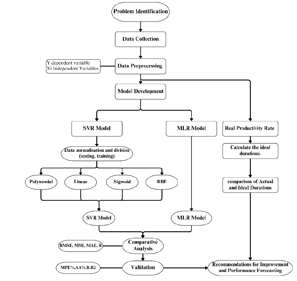 The construction industry is integral to economic development and prosperity, significantly influencing infrastructure, buildings, and housing projects [1, 2]. This sector constitutes a nation's economy's foundation, propelled by demographic expansion and changing social demands [3, 4]. Population expansion directly affects the need for housing developments, as the relationship between population and land allocated for housing in China was studied [5]. Researchers noted an increase in the number of people in urban areas compared to rural areas. In several countries, including Iraq, housing construction is obstructed by insufficient finance, inadequate investor protection regulations, and substandard infrastructure [6]. One of these countries, which suffers from a severe shortage of housing units, is Iraq. Despite of this, residential projects are the most common construction projects compared to other projects [7]. Alsamarraie and Ghazali believe that construction projects are the most important industries in the economy of Iraq [8]. Statistical reports indicate that Iraq's population will exceed 70 million in the next 20 years [9]. Despite its importance, the construction sector in Iraq faces many challenges, the most important of which is poor construction productivity [10]. Some studies have attempted to understand the factors affecting productivity in Iraqi construction projects as they suffer from performance issues [11]. This study explores how accurately completion time and delays can be predicted using machine learning models. The focus is on housing projects in Iraq, where rapid urbanization and severe housing shortages demand effective solutions. A comparative analysis was performed to evaluate the two-machine learning multiple linear regression MLR and support vector regression SVR prediction models. The choice of machine learning techniques depends on their unique functionalities. MLR offers clear insights into linear associations across variables, making it beneficial for preliminary assessments [12]. Conversely, SVR is proficient in identifying non-linear patterns and has robust generalization capabilities, even with constrained datasets, hence mitigating the challenges of data shortage often seen in the Iraqi construction sector [13]. This study aims to fill this gap by presenting an accurate and improved predictive model based on machine learning techniques (MLR and SVR) to measure the performance of construction teams in the execution of residential construction works. Unlike previous studies that focused on overall performance or costs, this study presents a comparative analysis of two linear techniques. It demonstrates which one is more accurate in predicting completion time based on actual data from residential projects implemented in Baghdad and central Iraq. The study provides new insights into construction performance trends for horizontal projects. It shows how predictive models can be used to make accurate decisions in project planning, improve productivity, and minimise delays. This study is one of the first to combine applied statistical analysis with the use of machine learning techniques in an Iraqi housing project environment with limited and unstructured data. The research provides a technique for estimating the duration and productivity required for housing project completion, enabling precise planning and productivity enhancement to increase housing availability.