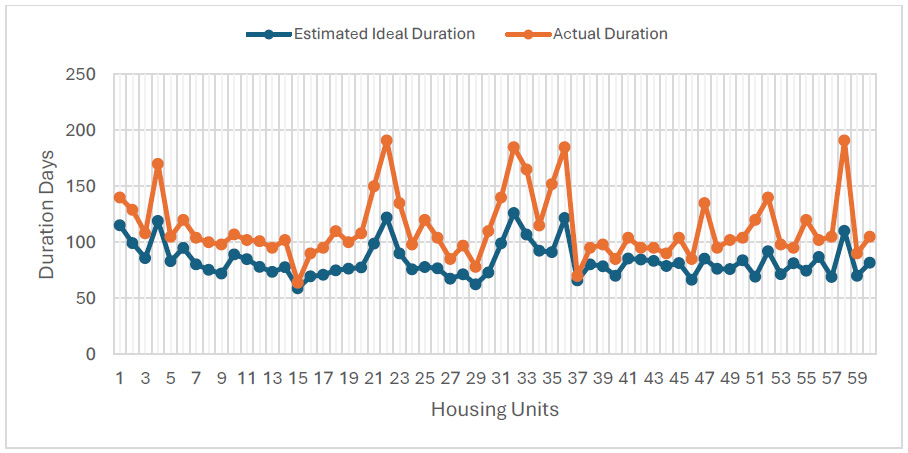 These results provide valuable insights into construction productivity, expressed in labour hours per square metre of built area. They enable experts to accurately estimate task duration, supporting accurate cost estimation and effective project planning. This contributes significantly to meeting the demand for housing units due to population growth.