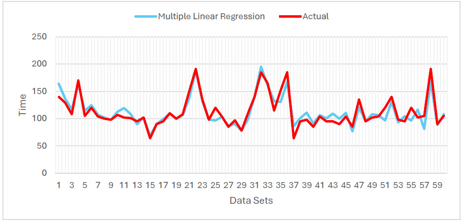 ‘The minimum acceptable sample size in regression analysis is 5 to 10 observations per independent variable’ [44]. Applying this rule, the number of independent variables in this study is 7, so the minimum acceptable sample size is between 35 and 70 data sets. Since the actual number of data is 60, the average data per variable = 8.57, which is within the acceptable statistical range to ensure the reliability and statistical significance of the model. A comprehensive assessment of data completeness was conducted to detect any missing values. Missing data points were addressed by imputation methods where applicable or removed if their absence was considered insignificant, assuring no substantial effect on the analysis. The correlation analysis was conducted, where the results showed a high correlation between real-time and input variables such as total area, built area, concrete work quantity, and brickwork quantity. Moderate correlations were found between the number of rooms and the number of brickwork team members, while lower correlations were found with the built ratio. Table 2 illustrates the correlation analysis.
