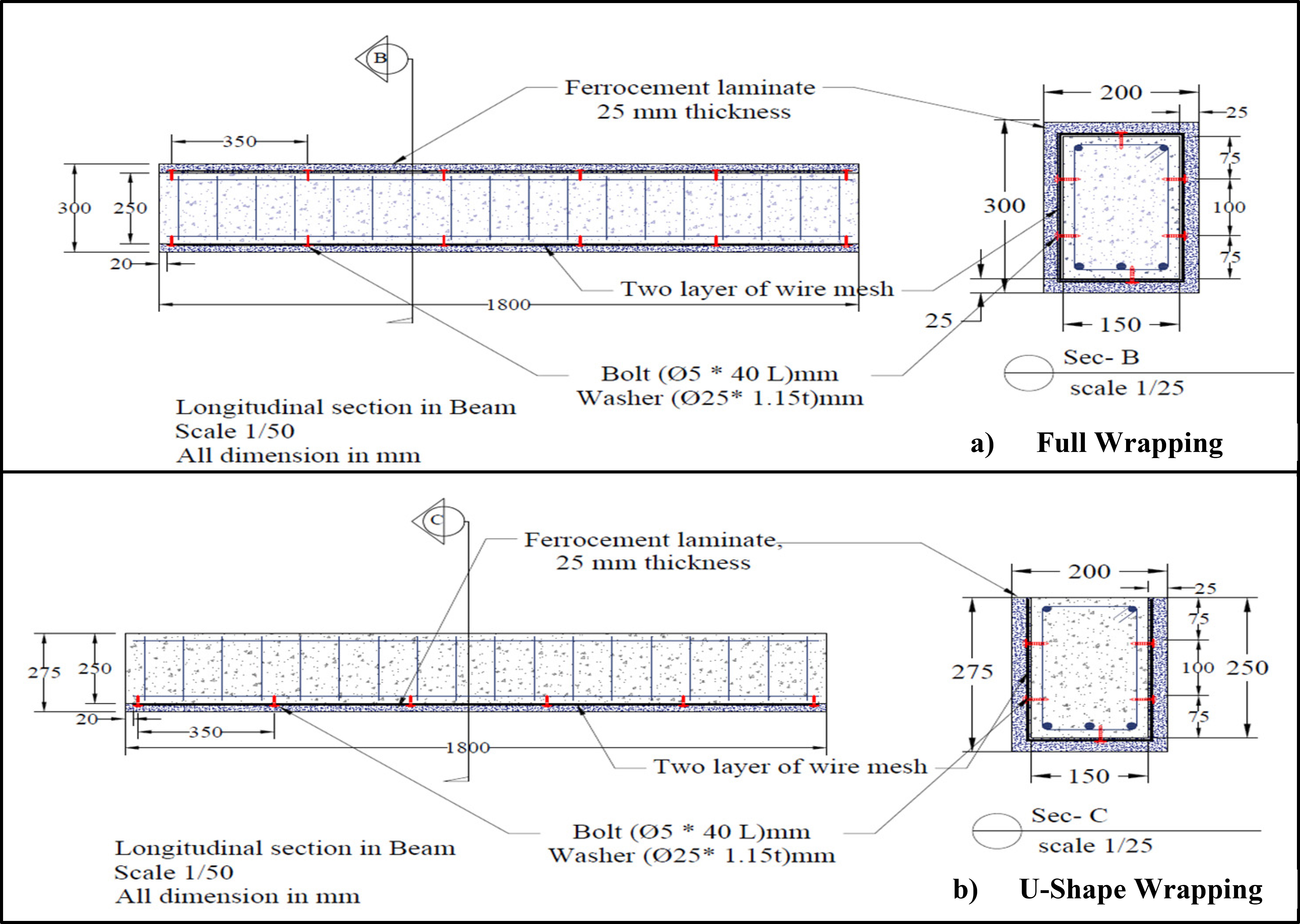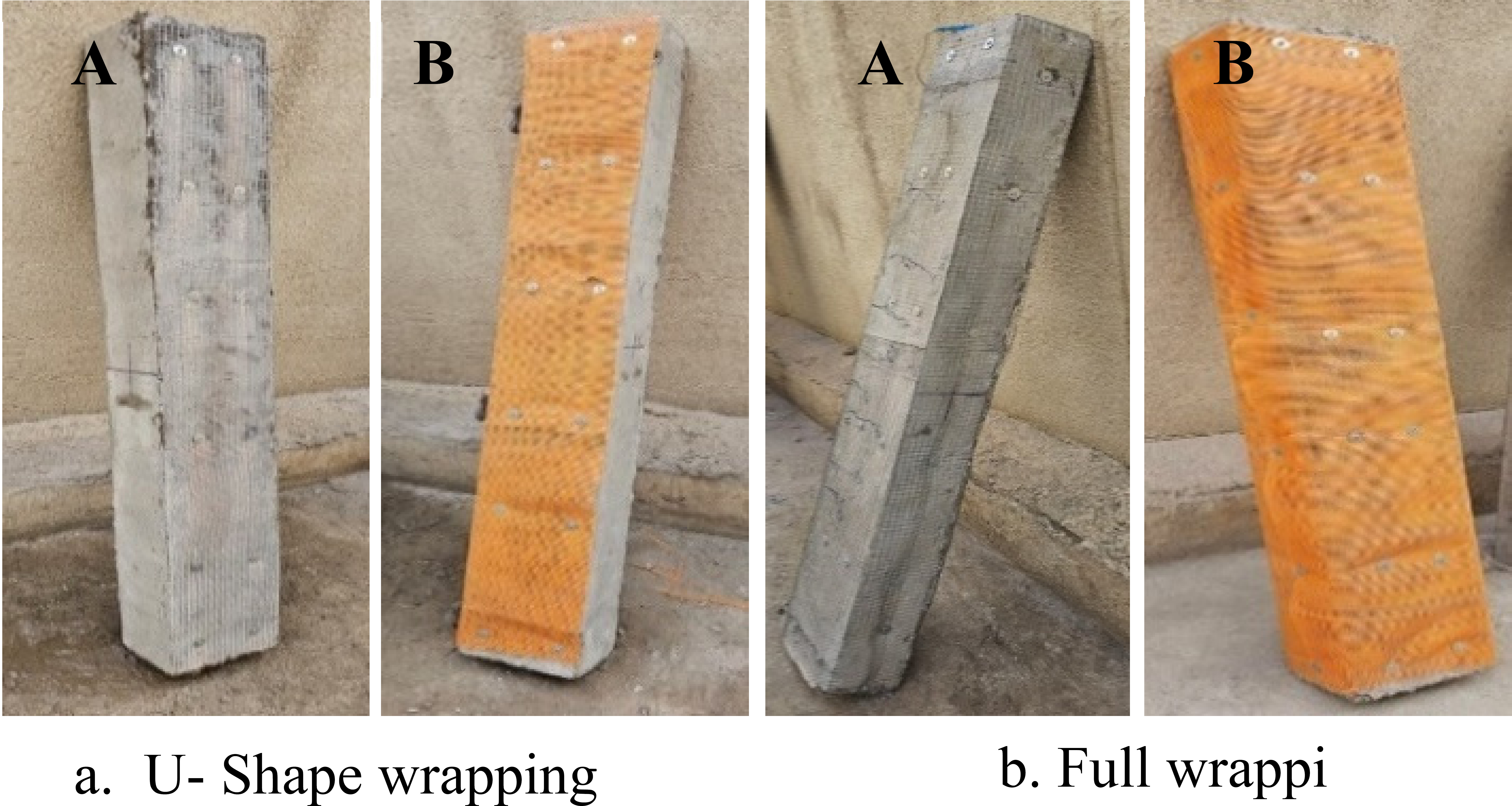 - Group 1 contains two beams, both of which have been retrofitted using traditional mortar and reinforced with welded wire mesh. One of them was retrofitted for full wrapping, while the other was retrofitted for U-shaped wrapping.