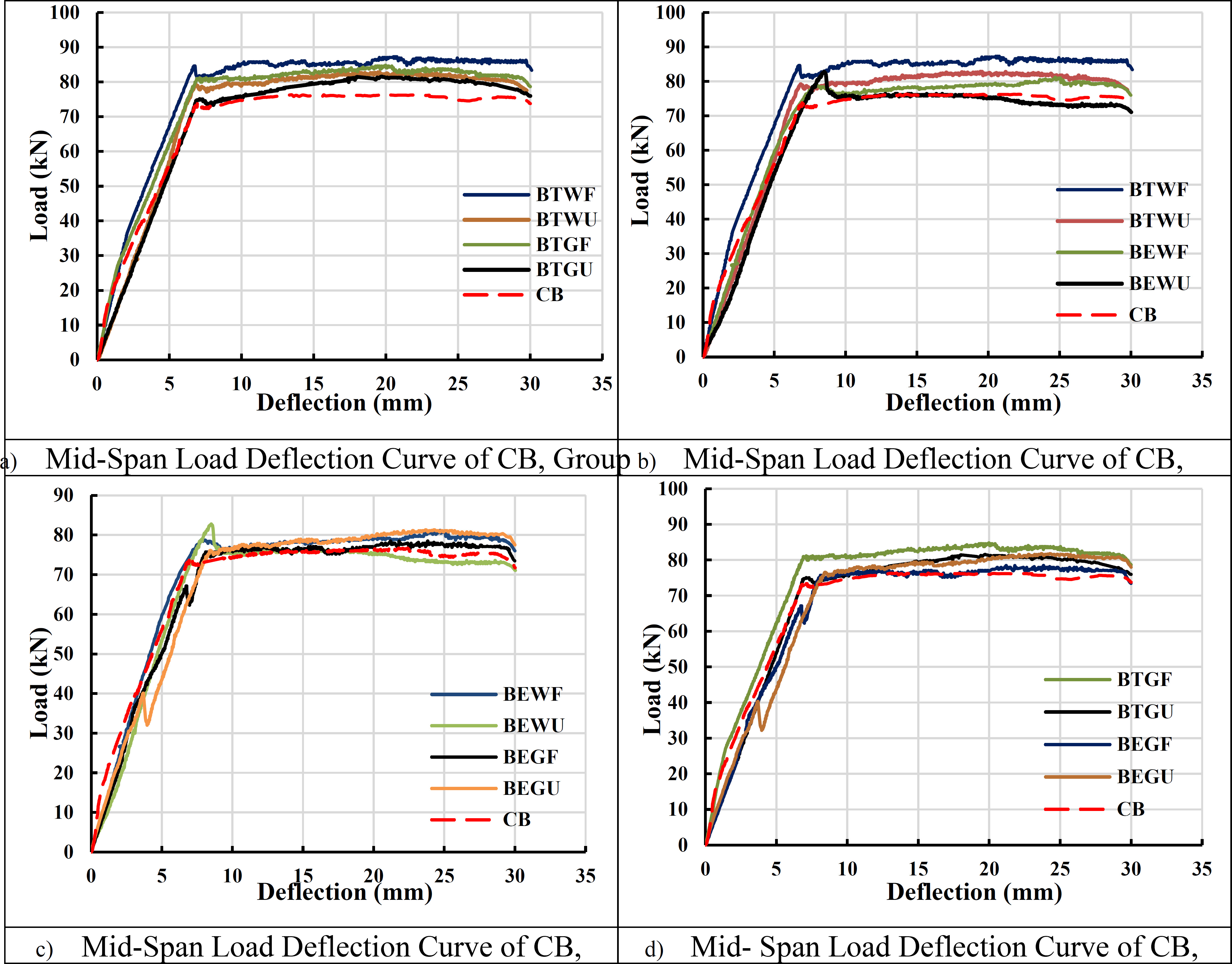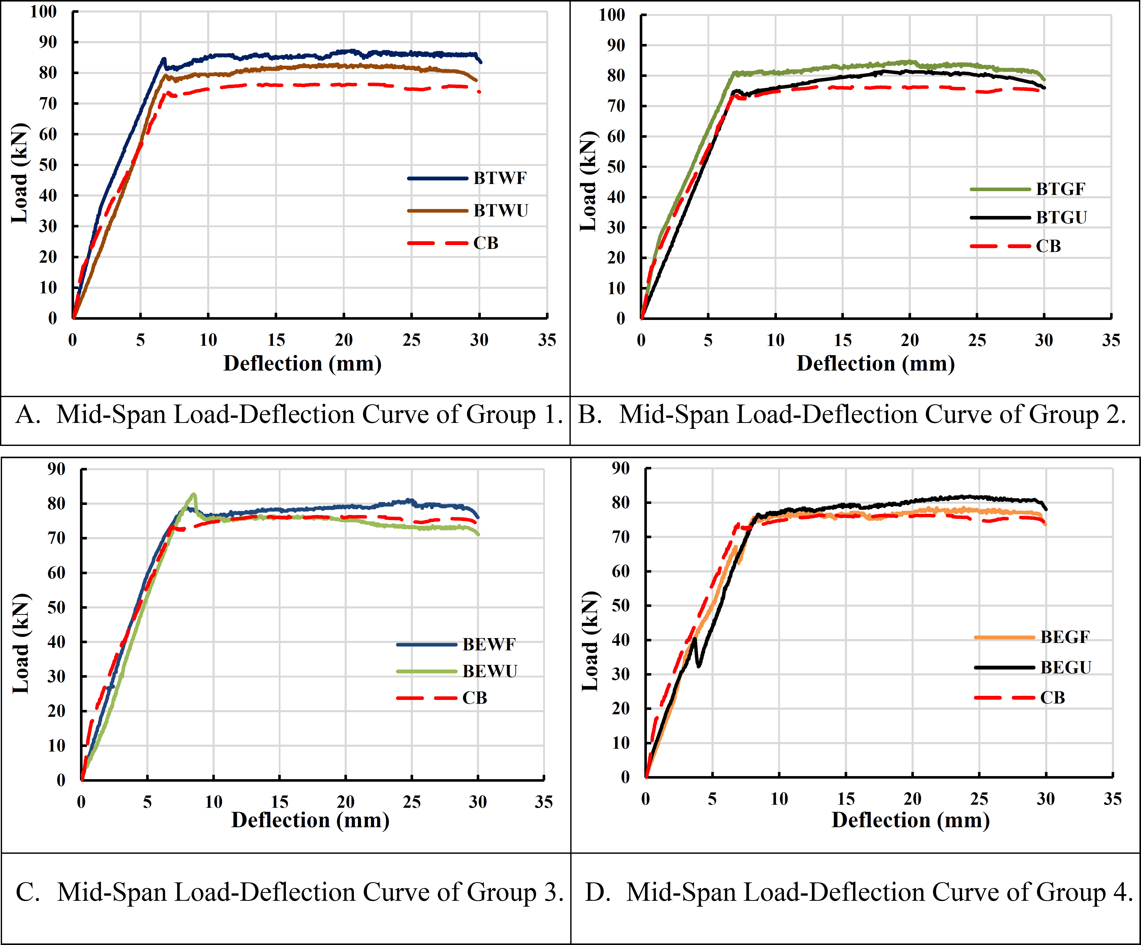 Mid span load deflection curve for all groups.