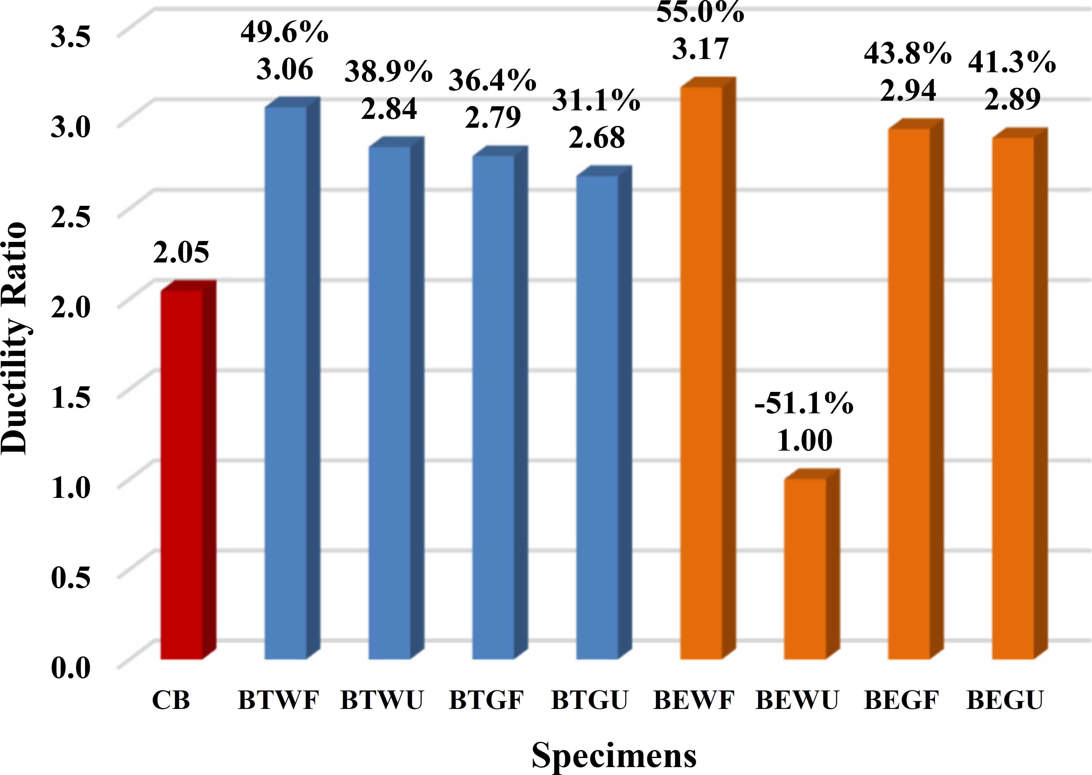Fig. (17) shows the ductility index, along with its increase and decrease percentages, for all tested beams. All the retrofitted beams showed an increase in ductility index compared to the control beam, except for beam (BEWU). This beam exhibited a decrease in ductility index due to the sudden failure that occurred as a result of using eco-friendly materials.