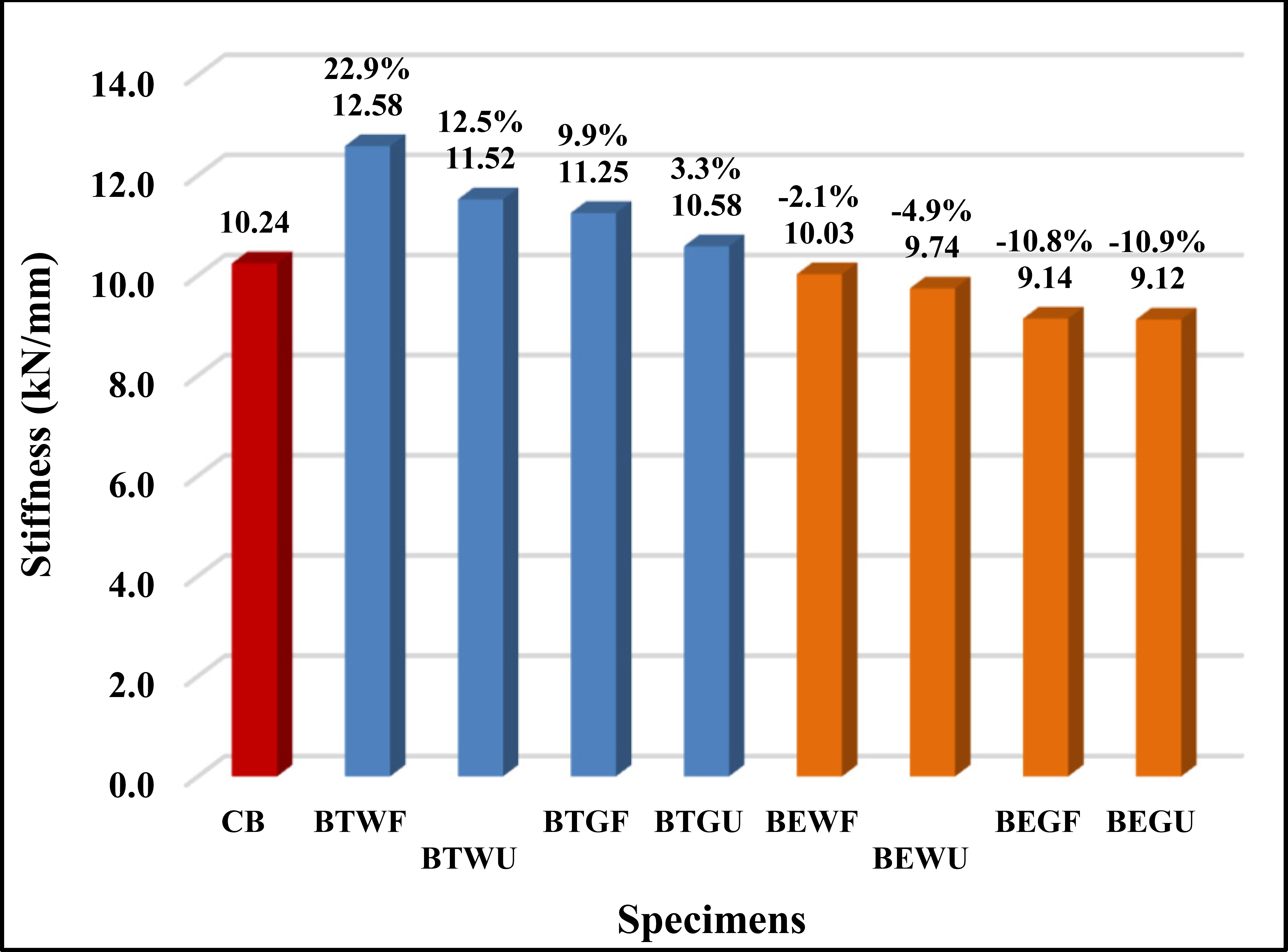 Stiffness and increase or decrease ratio for the tested beams.