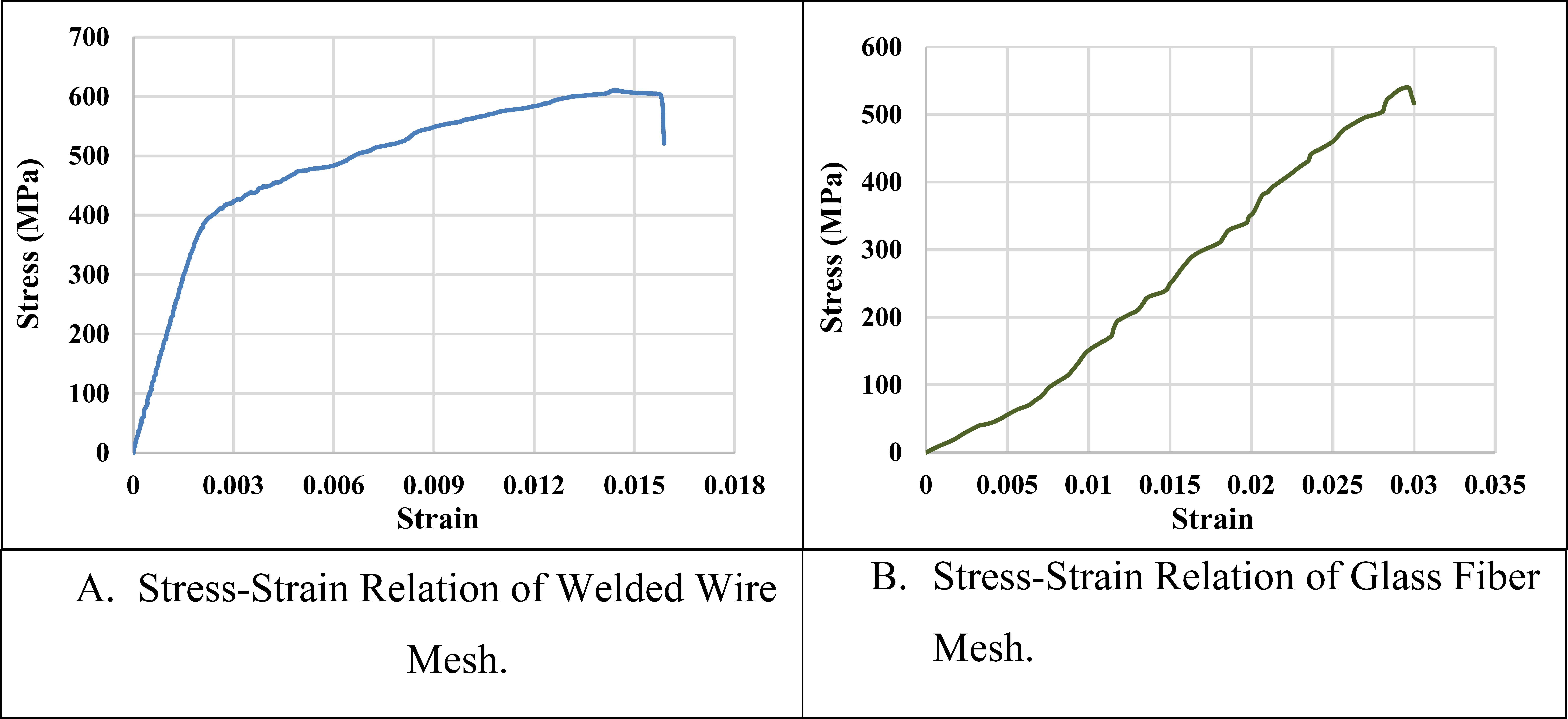 Two types of mesh reinforcement were used in this study, including welded steel wire mesh and glass fiber mesh, as shown in Fig. (5a, b). The properties of both types of mesh are listed in Table 5. Fig. (6a, b) shows stress-strain relations for welded wire and glass fiber mesh.