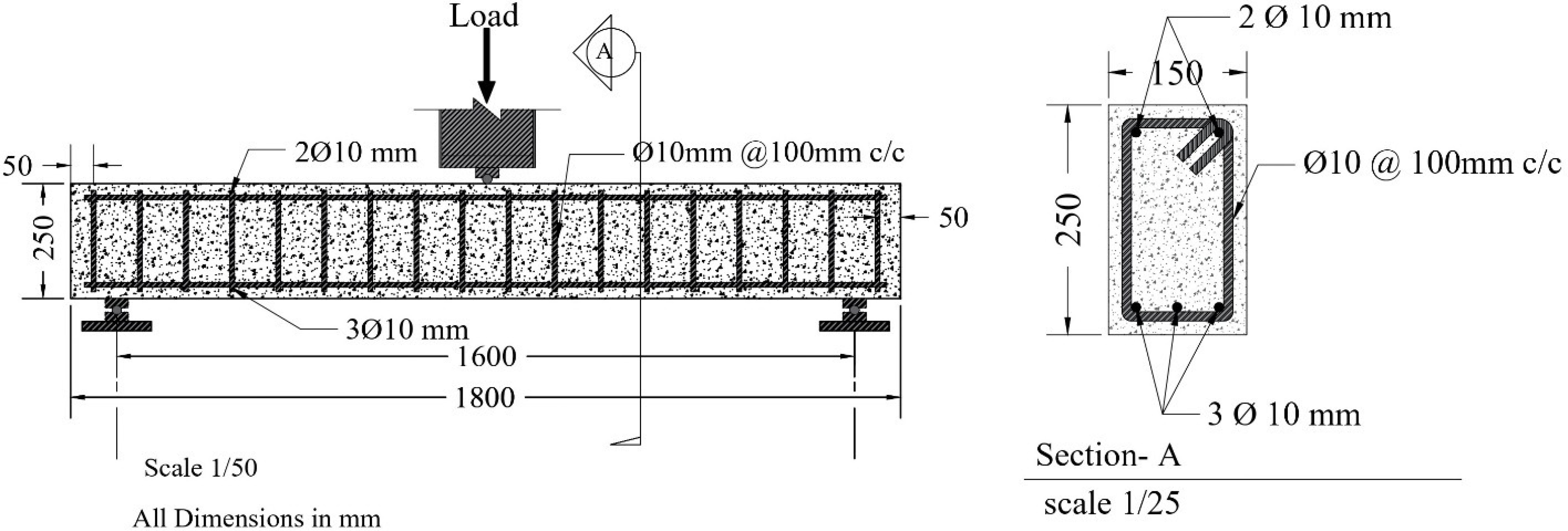 Fig. (7) demonstrates the details of the beams used in this study. These beams were designed according to the Building Code Requirements for Structural Concrete (ACI 318M-19) [16]. These beams were tested by applying center-point loading as shown in Fig. (7).