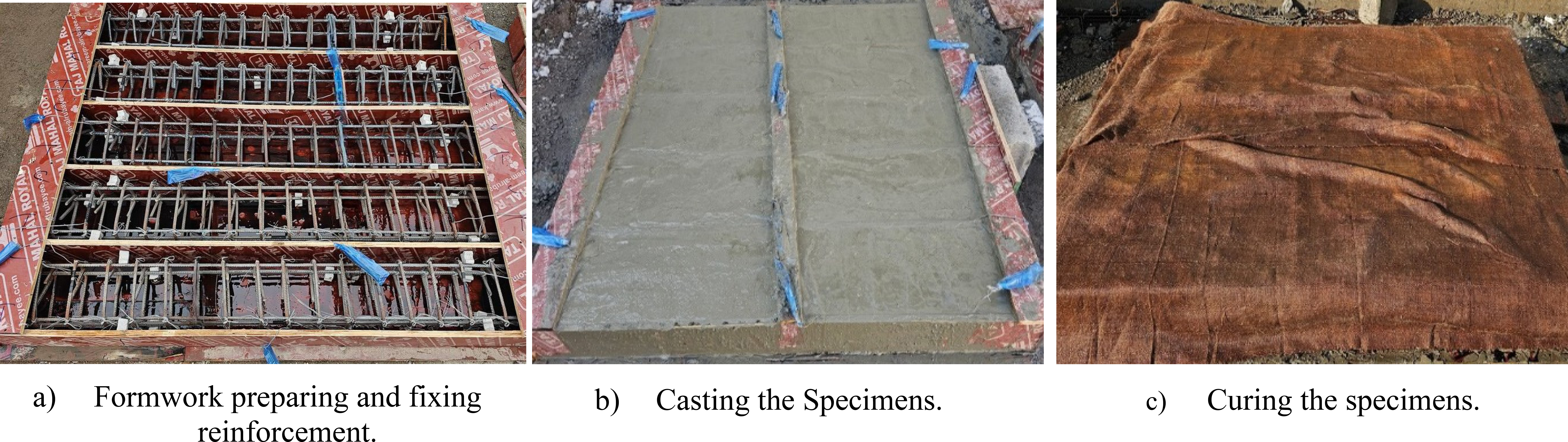 Two wooden formworks were prepared and placed on the ground in an equilibrium status. The steel cages were fixed inside the formworks as shown in Fig. (8a). The concrete was then poured as shown in Fig. (8b). A total of ten reinforced concrete beams were cast using concrete with a mix ratio of (1: 1.906: 2.787/0.47). After 24 hours, the outer side of the wooden formwork was removed.Afterward, the specimens were cured for 28 days using wetted jute bags and covered with plastic sheets as shown in Fig. (8c).