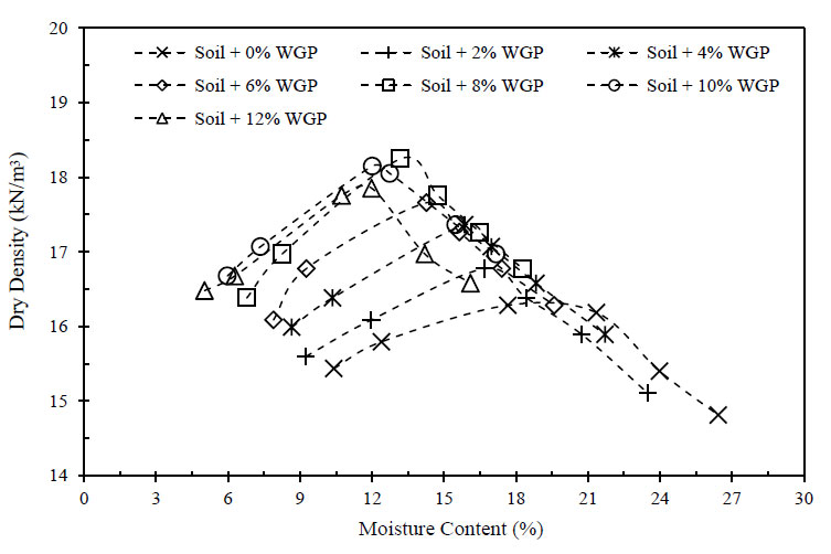 Compaction test results of untreated Soil and soil-WGP mixtures.