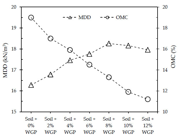 The effects of WGP on MDD and OMC for different percentages (i.e., 2%, 4%, 6%, 8%, 10%, and 12%) of WGP by dry weight are illustrated in Fig. (10), which presents the variation of dry density with moisture content for soil and soil-WGP mixtures. A notable shift in the compaction curves towards the upper left corner is observed with the addition of WGP, which is typically expected for soils that are similarly improved. Several investigators have reported the shift of the compaction curves due to the addition of WGP [28, 36, 37, 53, 73, 74]. The MDD of the untreated soil was 16.28 kN/m3 and increased to 18.26 kN/m3 when 8% of WGP was added, and then started to decrease after further addition of WGP. On the contrary, OMC decreased from 19.0% to 11.8% by adding up to 12% WGP, suggesting improved compaction behavior. The denser packing is due to the angularity and granular nature of WGP, which fills the voids within the soil matrix. (Fig. 11) summarizes this trend by plotting MDD and OMC against WGP content. These results suggest that a WGP content of nearly 8% by dry weight, which falls within the range of values reported by other researchers [28, 36, 37, 53, 73, 74], may be considered as the optimum amount for stabilizing low plastic silt-type soil at the early stage.