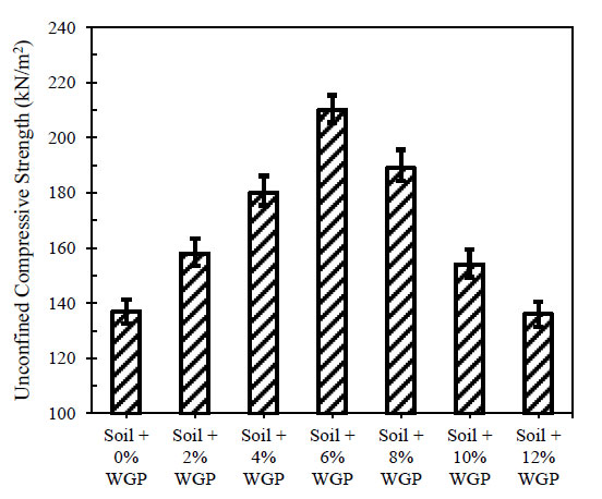 The UCS results of soil-WGP mixtures are illustrated in Fig. (12). The unconfined compressive strength increased significantly with the addition of WGP, peaking at 210 kN/m2 for 6% WGP, compared to 137 kN/m2 for untreated soil. Beyond this percentage (i.e., 6%), the strength declined to 136 kN/m2 at 12% WGP. This trend may suggest an optimum dosage of WGP of 6% for low plastic silt-type soil under early improvement conditions. The optimum WGP content of 6% found here aligns with the range of values reported in earlier studies [28, 36, 37, 53, 73, 74].