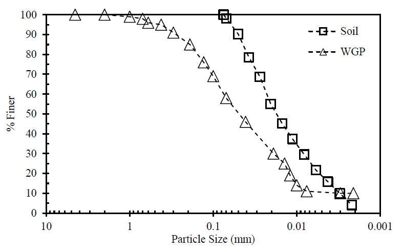 The pozzolanic properties of WGP render it an appropriate stabilizing agent for soils. Cementitious substances are formed when WGP is combined with soil and undergoes a pozzolanic reaction with calcium hydroxide and water [34, 35, 38, 49-52]. In the absence of cement or lime, cementitious compounds may also form in soils that naturally contain calcium-bearing minerals or free calcium hydroxide in alkaline water [28, 53, 54]. These cementitious substances enhance the bonding between soil particles, resulting in improved compaction characteristics, increased compressive strength, and reduced permeability. Furthermore, WGP may act as a filler, resulting in more mechanical interlocking, thus increasing the internal friction of the soil matrix [37, 48, 55-58]. This makes WGP a viable alternative to conventional stabilizers, particularly in regions where industrial byproducts and construction waste are readily available [59-61]. Despite earlier studies examining the effects of other waste products, such as fly ash and rice husk ash, on soil stabilization, research on the geotechnical applications of WGP remains limited [62-65]. Comprehensive investigations are necessary to assess the WGP’s efficacy in enhancing soils under diverse conditions, including different soil compositions, moisture contents, and curing periods [66-71].