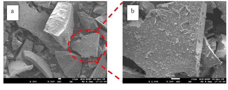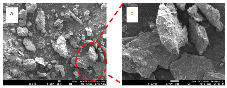 SEM images of the soil sample at (a) 300X, (b) 1000X magnification.