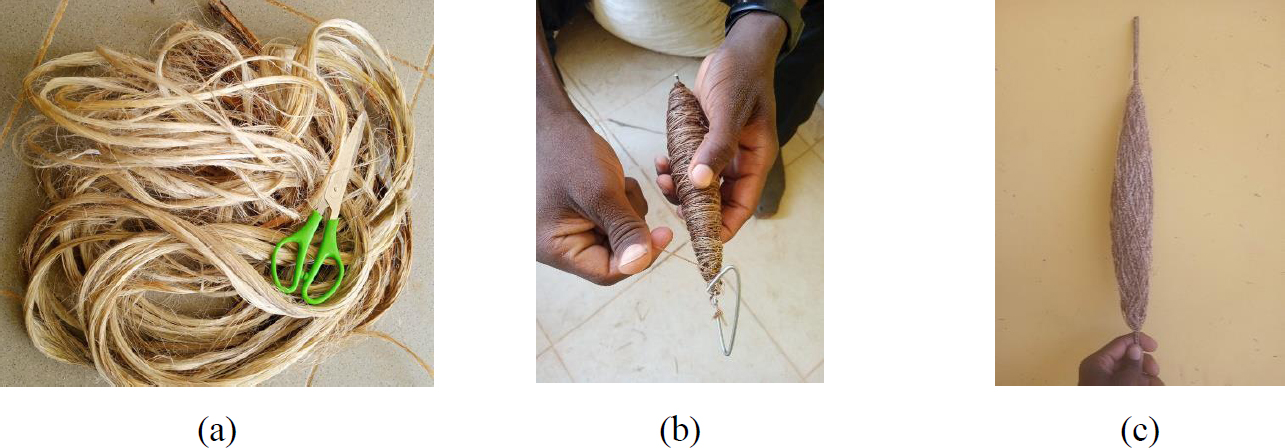 Raw kenaf fibers (a), manual spinning of the fibers (b), and yarns produced from spinning (c).