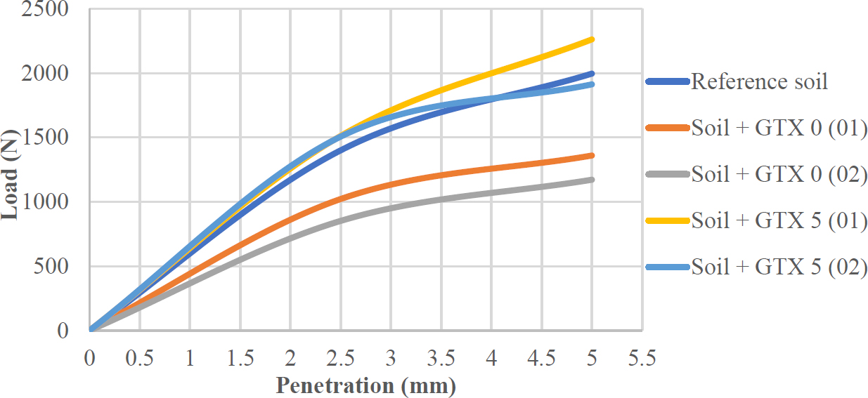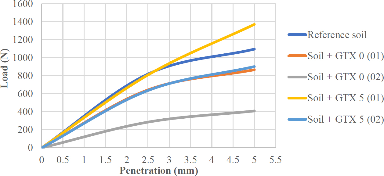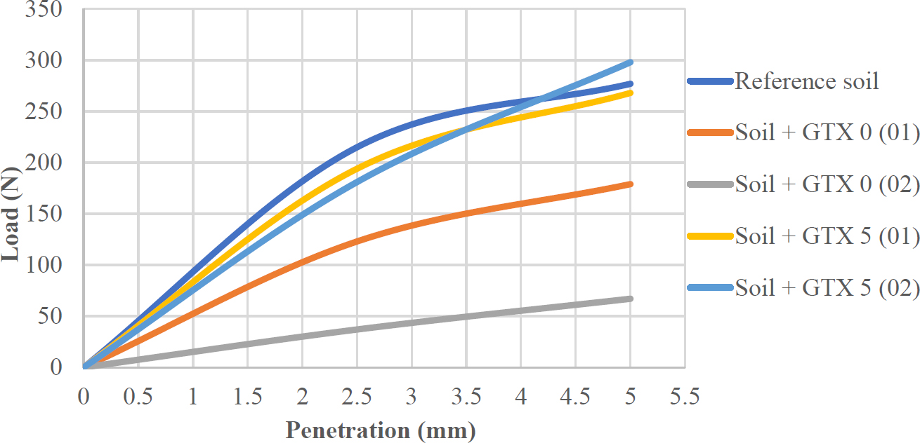 - Soil + GTX 0 (02): reference soil with two 0 mm geotextile layers,