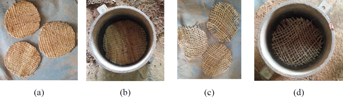 0 mm geotextile samples cut (a) and placed halfway up the mold (c); 5 mm geotextile samples cut (b) and placed halfway up the mold (d).