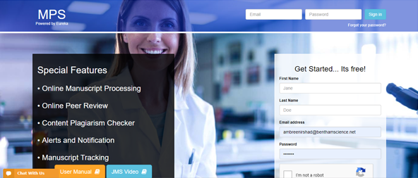MPS is a user-friendly system that can be conveniently operated. The system allows rapid and easy submission of original and revised manuscripts and indicates their status throughout the submission process. Authors accessing the system for the first time will be required to Register themselves online at https://bentham.manuscriptpoint.com/index.php/Login/show_login and create an MPS account to submit a paper to a particular journal from the available list in the registration form.